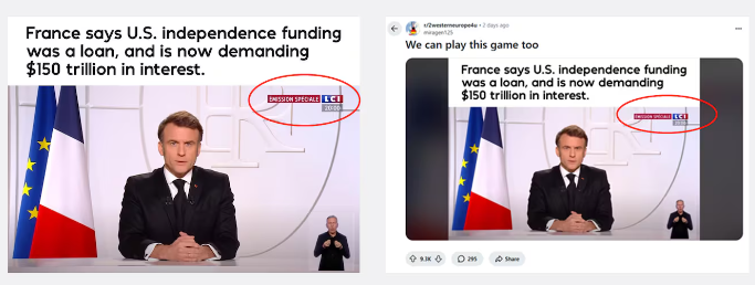 有趣的是,就在萊維特對法國發表爭議言論之際,美國網絡上正在流傳一則“法國以償還獨立戰爭貸款之名向美國索要150萬億美元”的消息,讓不少美國網民信以為真,在傳播了一段時間後,該消息被證實是挪用舊視頻畫面虛構的“假新聞”。