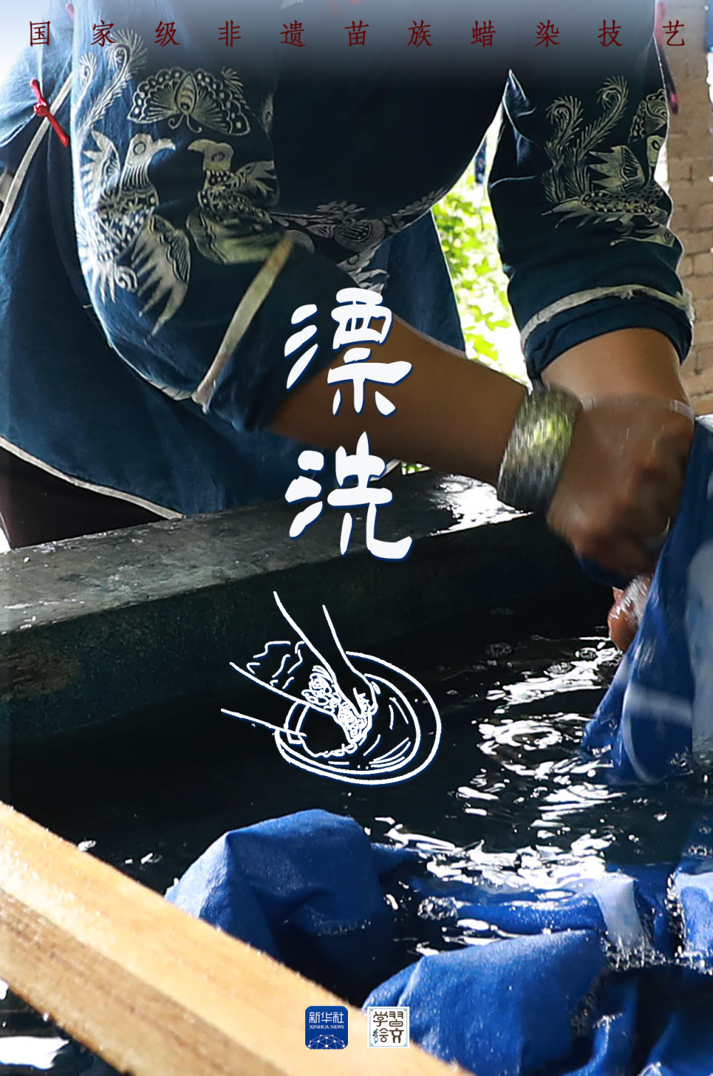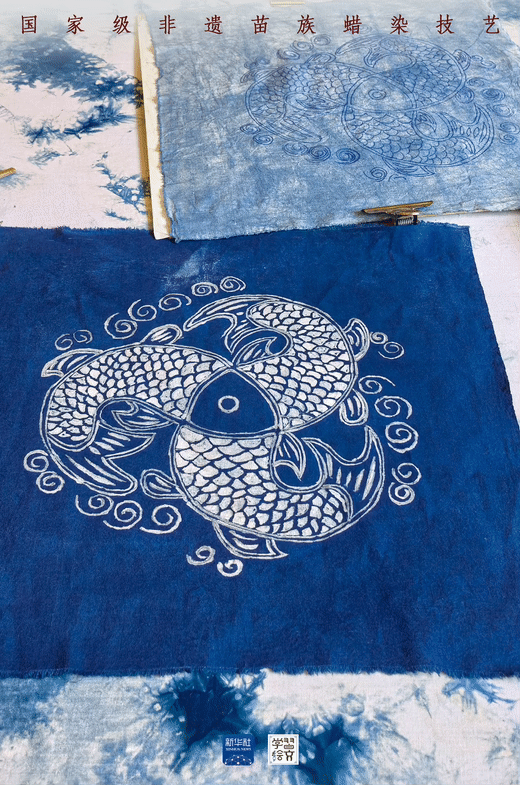 染色,就是將畫好圖案的土布,放入藍靛染缸中,反覆浸泡多次,確保其上色。其間,作為防染劑的蠟自然龜裂,使布面呈現特殊的“冰紋”,具有獨特魅力。
