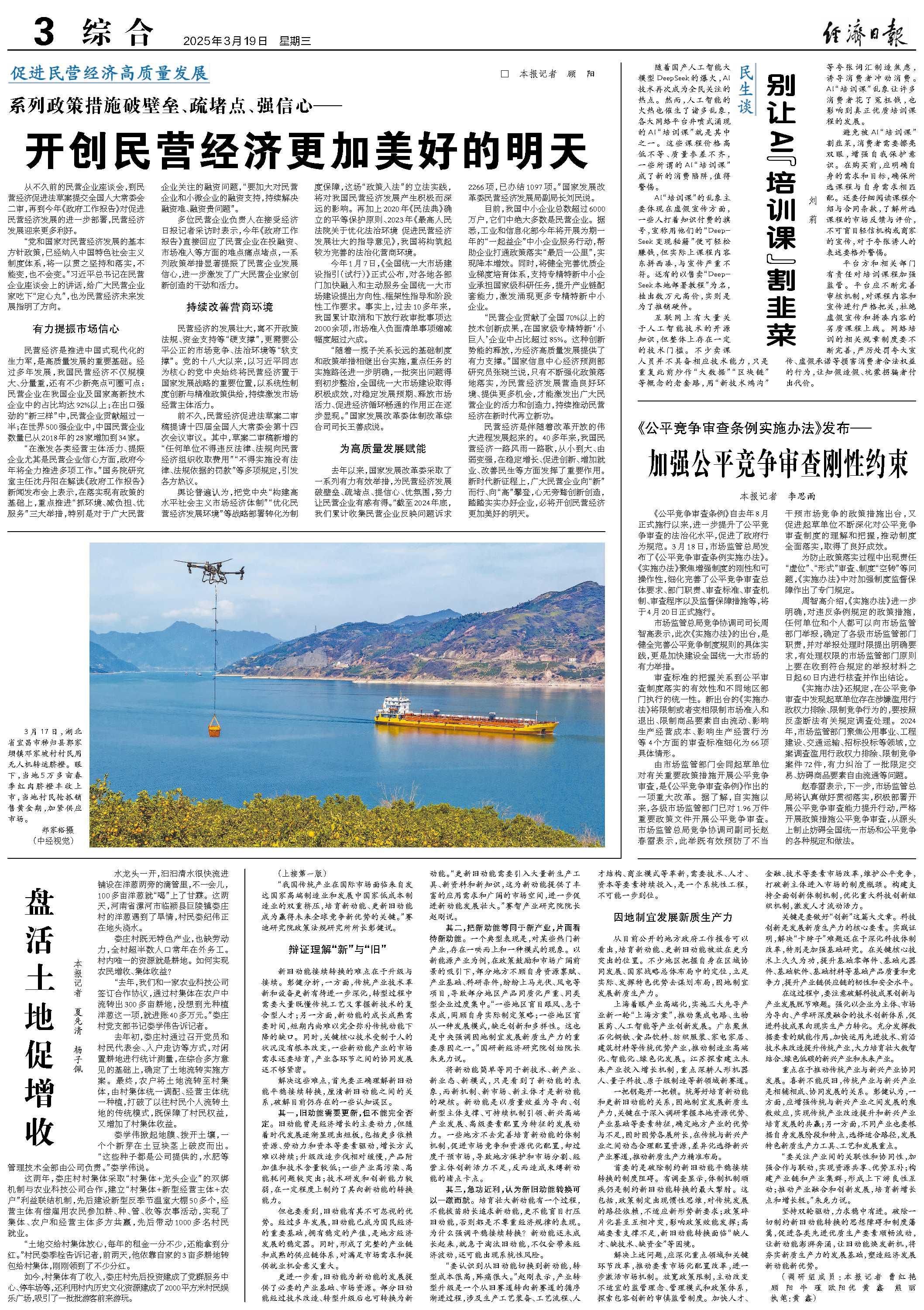 輿論普遍認為,把黨中央“構建高水平社會主義市場經濟體制”“優化民營經濟發展環境”等戰略部署轉化為制度保障,這場“政策入法”的立法實踐,將對我國民營經濟發展產生積極而深遠的影響。再加上2020年《民法典》確立的平等保護原則、2023年《最高人民法院關於優化法治環境 促進民營經濟發展壯大的指導意見》,我國將構築起較為完善的法治化營商環境。