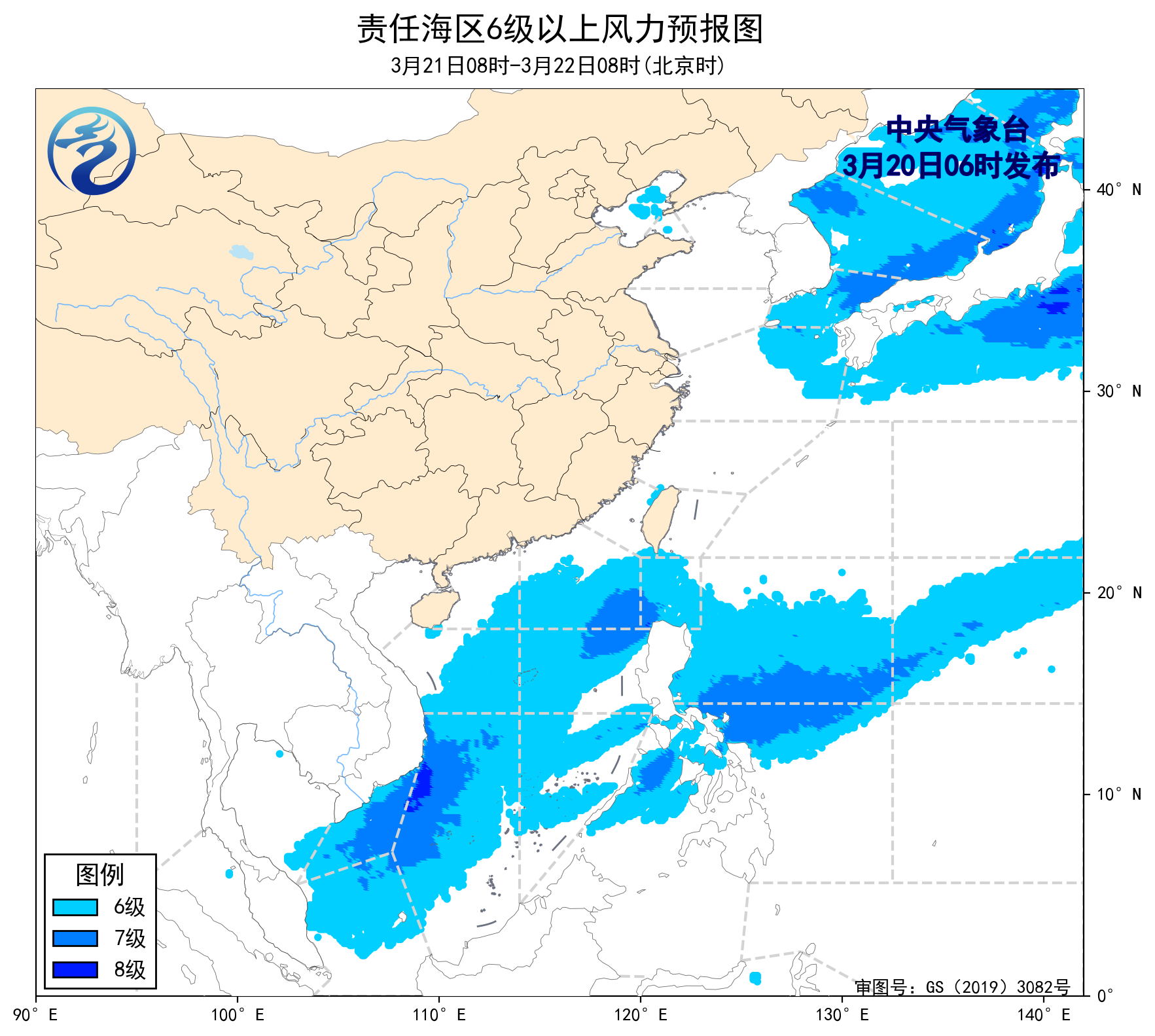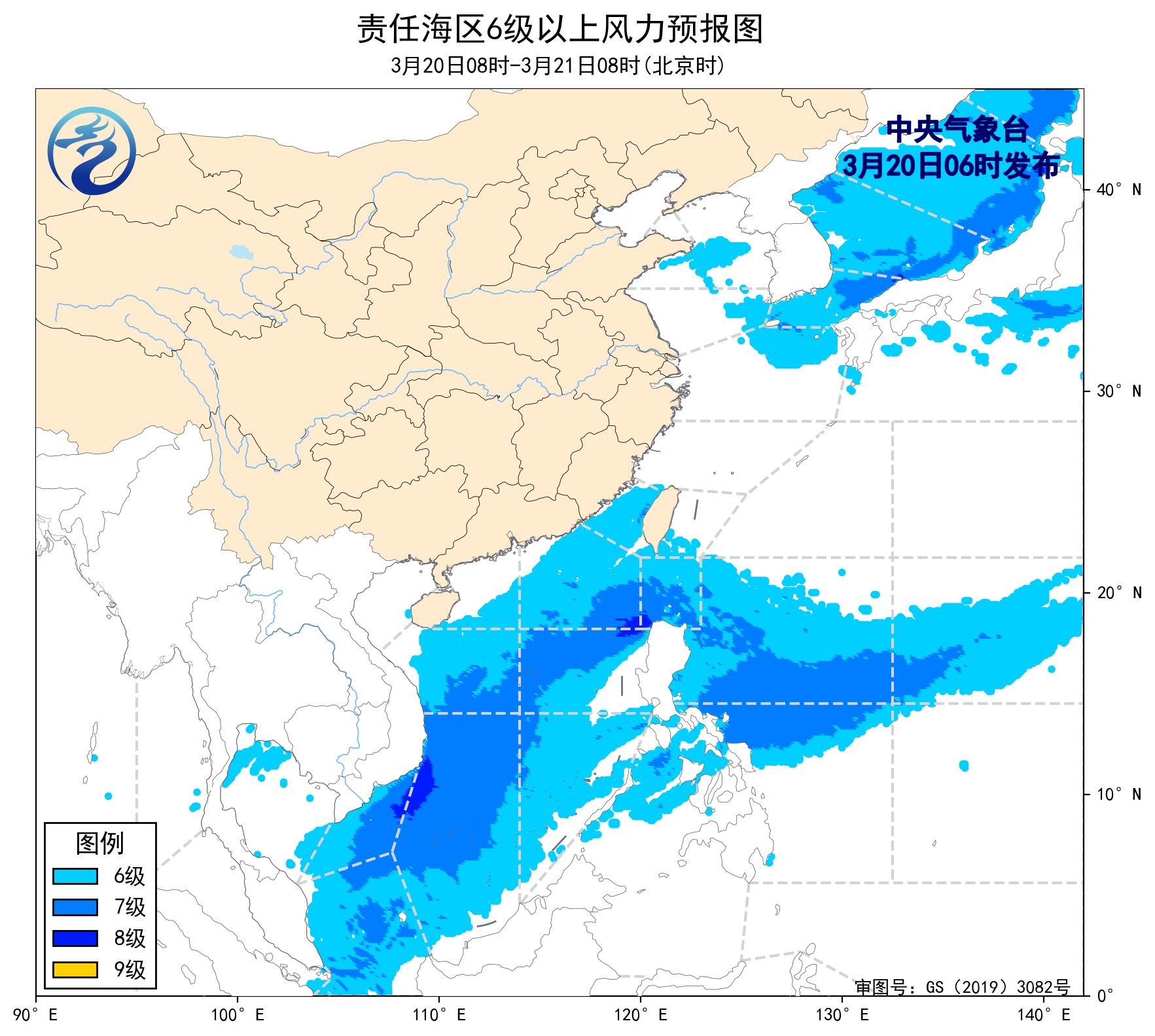 20日08時至21日08時,巴士海峽、南海東部、中西部和南海西南部海域將有5~7級、陣風8級的東北風,其中巴士海峽、南海東北部和西南部的部分海域風力可達8級、陣風9級,黃海中部和南部海域、東海北部海域將有4~6級、陣風7級的偏西到西南風,台灣海峽、台灣以東洋麪、南海西北部海域將有4~6級、陣風7級的偏北到東北風。