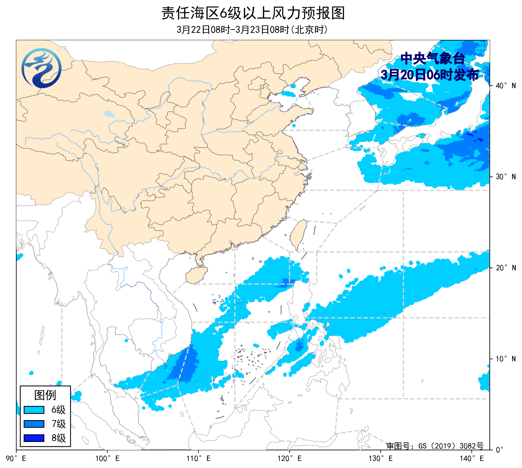 3月19日14時至20日02時,台灣海峽、巴士海峽、南海大部海域出現了5~7級、陣風8級的東北風或偏北風,遼東半島東部沿岸海域出現了能見度不足10公里的輕霧。