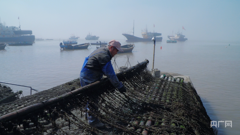 大岙村紫菜養殖户虞新解清理紫菜養殖排架(央廣網發 吳寶春 攝)