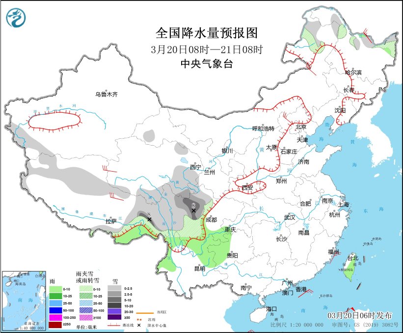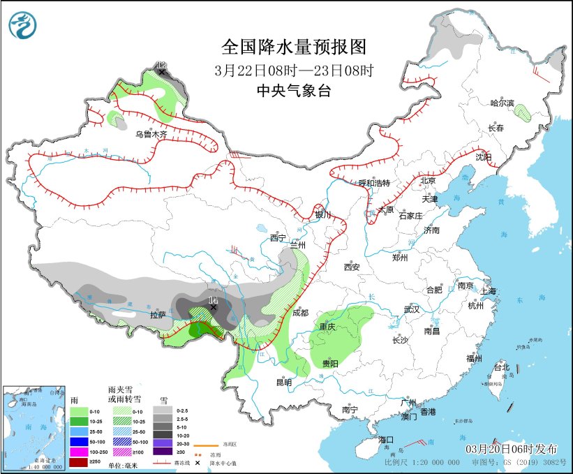 預計3月20日至23日,青藏高原東部和西南地區多陰雨雪天氣,青海東南部、西藏東部、川西高原、雲南西北部和東北部、貴州西北部等地有小到中雪或雨夾雪,其中,西藏東部和川西高原等地局地有大雪或暴雪;西藏東南部和雲南西北部等地的部分地區有中雨,局地大雨。