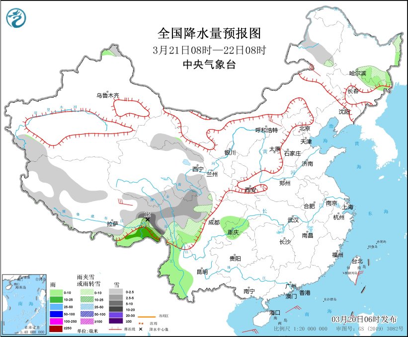 *3月20日08時至21日08時,*新疆南疆盆地西南部、西藏東部、青海東南部、川西高原中北部以及內蒙古東北部、黑龍江北部等地部分地區有小雪或雨夾雪,其中,西藏東部、青海東南部、川西高原北部等地部分地區有中到大雪(5~8毫米)。西藏東南部、四川盆地南部、重慶西南部、貴州西部、雲南西北部和東北部、台灣島大部等地部分地區有小雨。西藏北部、青海西部、河北北部等地部分地區有4~6級風,陣風6~7級風;台灣海峽、巴士海峽、南海大部海域將有5~7級風、陣風8~9級(見圖1)。