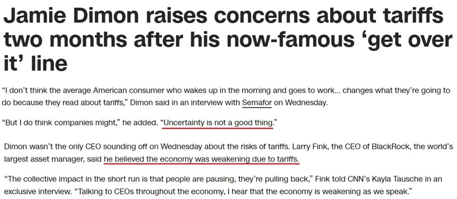 然而兩個月後,隨着美國股市下跌和經濟出現動盪,戴蒙開始對關税表示擔憂。他日前接受採訪時強調,“不確定性不是一件好事”。