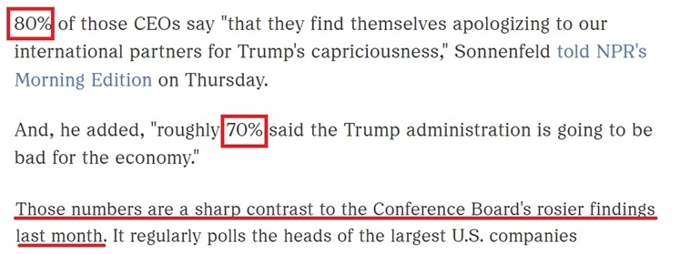 報道援引耶魯大學管理學院副院長索南菲爾德的話説,這些企業老總現在“非常沮喪”,其中大約70%的人表示特朗普的政策將對經濟不利;80%的人表示,他們現在“不得不為政府的反覆無常向國際合作夥伴道歉”。