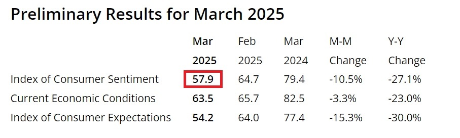 美國密歇根大學發佈的最新報告顯示,3月美國消費者信心指數僅為57.9,連續第三個月下滑,已經降至2022年11月以來的最低值。