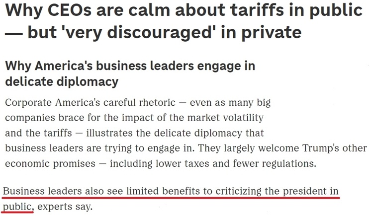 報道稱,美國商界領袖不願公開與白宮唱反調,一方面是因為他們大多歡迎特朗普政府的其他經濟承諾,比如減少税收和監管;另一方面,在當前環境下,他們也意識到公開批評白宮沒什麼好處,況且他們也不想讓投資者過分恐慌。