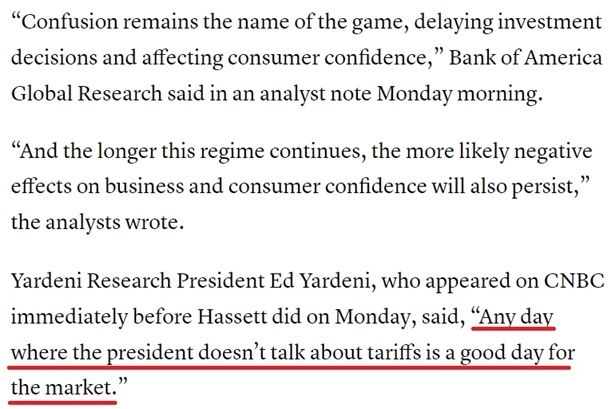 美國亞德尼研究公司總裁埃德·亞德尼乾脆直言,特朗普“不談論關税的任何一天對市場來説都是好日子”。