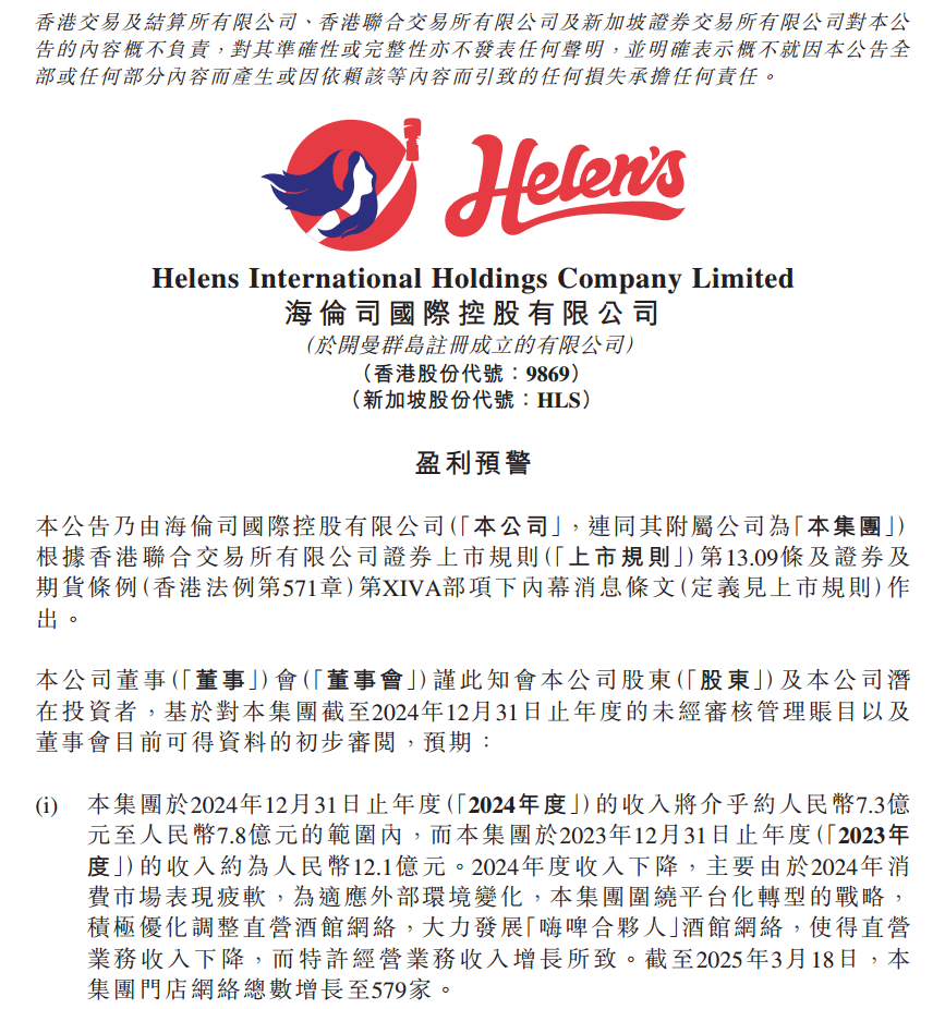 【環球網消費綜合報道】在消費市場深度調整的背景下,國內知名連鎖小酒館運營商海倫司(Helen’s)近日發佈2024年度盈利預警,預計年度收入同比下降35.5%~39.7%,經調整淨利潤減半,面臨上市以來首次股東應占虧損。這一業績下滑與其門店總數增長至579家的擴張態勢形成鮮明對比,揭示了酒飲消費市場的結構性矛盾。
