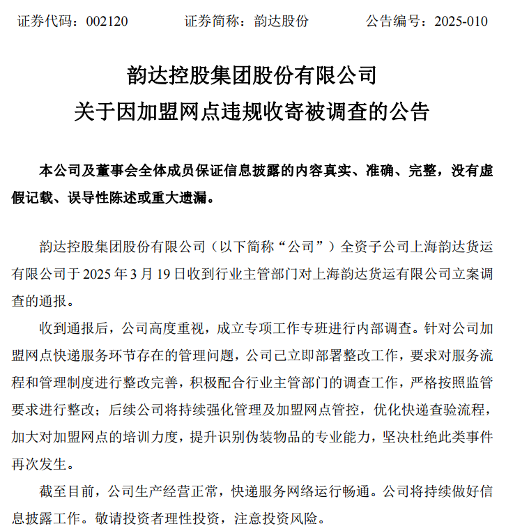 上海韻達貨運是A股上市公司韻達股份的全資子公司,主要從事快遞業務,同時涉及供應鏈、國際、冷鏈等周邊產品線。針對此次立案調查,韻達股份迅速作出回應,表示已立即部署整改工作,並將持續強化對管理及加盟網點的管控。