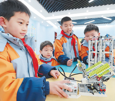 浙江湖州春暉小學科創空間實驗室裏,小學生學習操控智能組件。謝尚國攝(人民視覺)