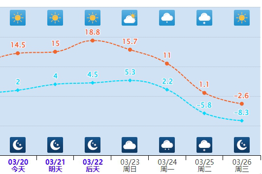 但春分時節冷空氣依然活躍,氣温波動還比較大。這次大回暖過後,下週冷空氣還將“返場”,由於冷空氣實力強,而且基礎氣温顯著偏高,因此下週降温將十分明顯。