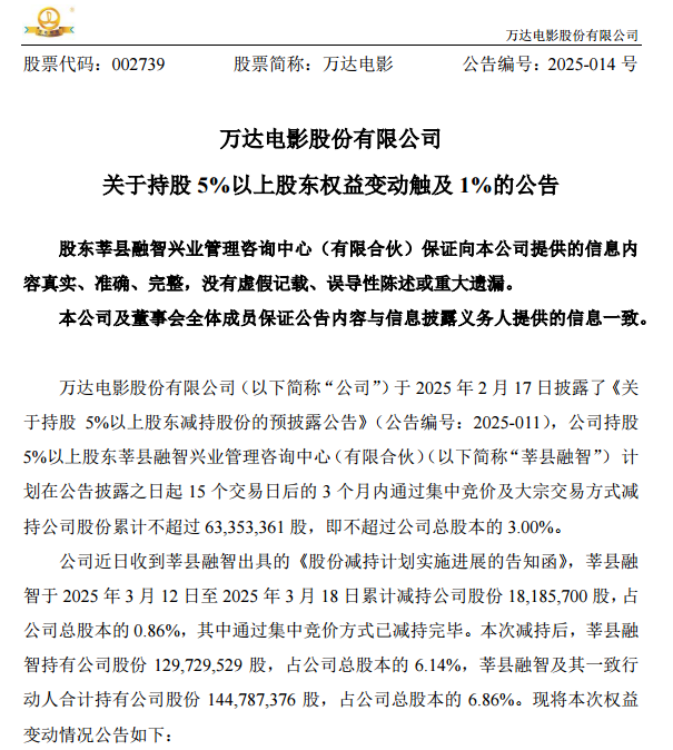 【環球網消費綜合報道】3月20日,萬達電影(002739.SZ)發佈關於持股5%以上股東權益變動觸及1%的公告。公告顯示,公司持股5%以上股東莘縣融智興業管理諮詢中心(有限合夥)(以下簡稱“莘縣融智”)近期累計減持公司股份1818.57萬股,持股比例降至6.14%。