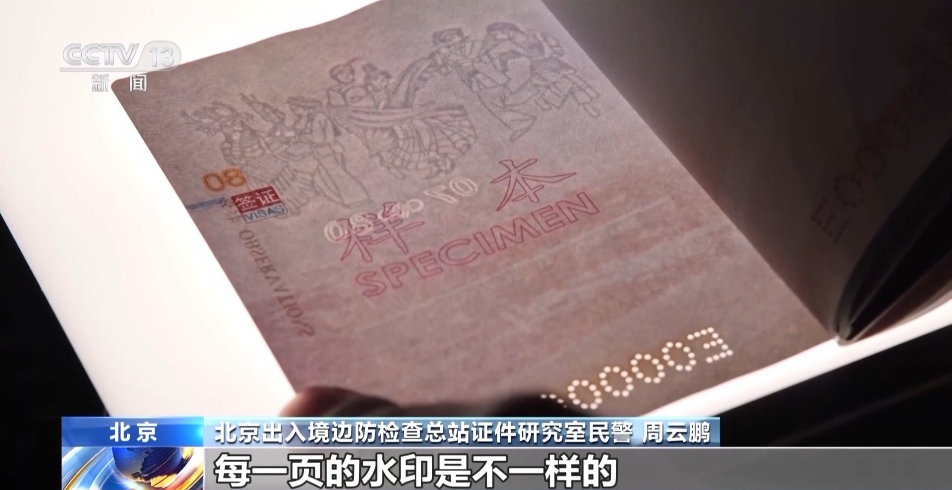*北京出入境邊防檢查總站證件研究室民警 周雲鵬:*這裏採用的是長城,其實內頁裏邊也採用了很多不同的圖案,特別是後邊每個省份一些地標性的名勝古蹟都有體現。