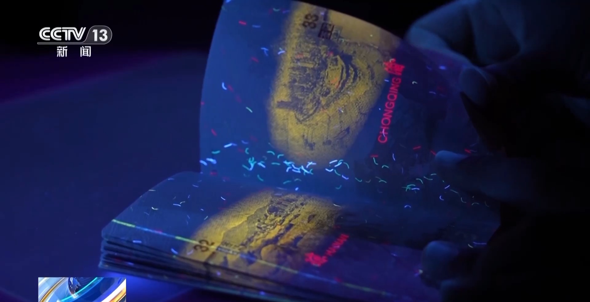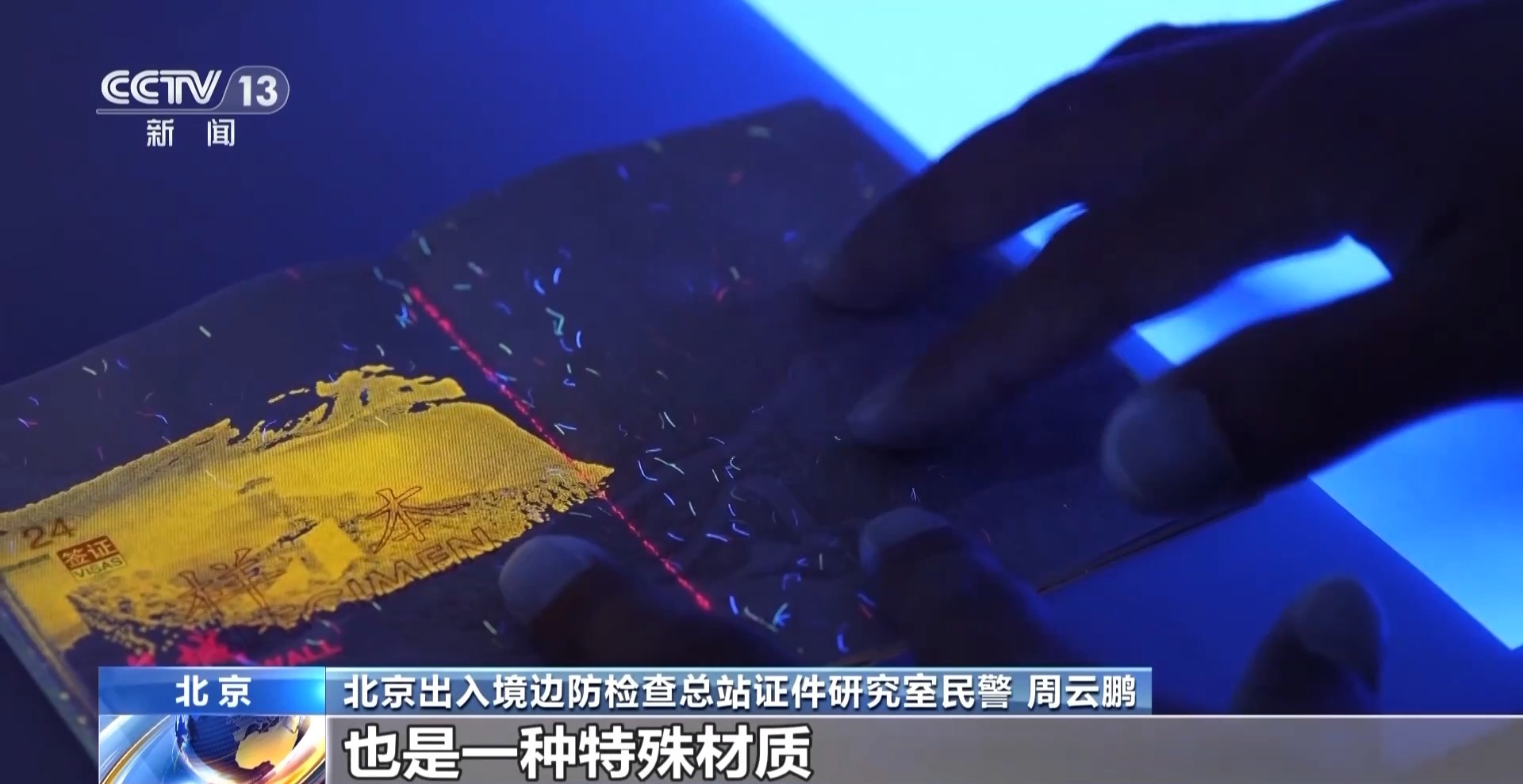*北京出入境邊防檢查總站證件研究室民警 周雲鵬:*護照的中間,採用的裝訂線也是一種特殊材質,在紫外燈光下可以看到,這個線通體呈紅色反應,其實這也是一種防偽措施,在日光燈下看,它其實是白色、淡藍色、淡黃色三種不用顏色的線擰合而成的。