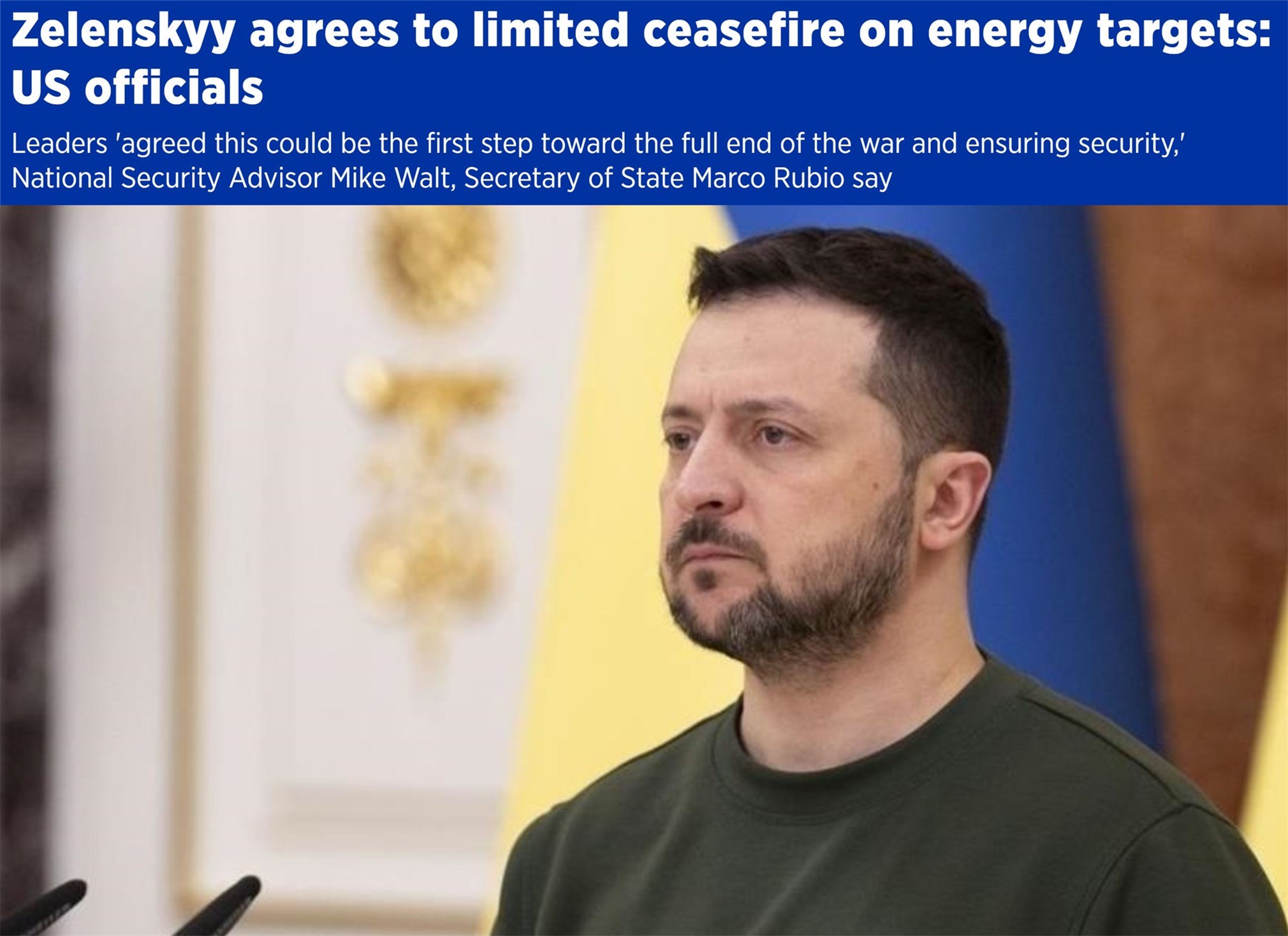 這份由美國國務卿魯比奧和總統國家安全事務助理華爾茲共同簽署的聲明説,美烏兩國技術團隊未來幾天將在沙特阿拉伯會談,討論將停火範圍擴大到黑海,以實現全面停火。美烏元首一致認為,實現針對能源設施的停火併將停火範圍擴大到黑海,可望成為邁向全面結束烏克蘭衝突和確保烏克蘭安全的第一步。
