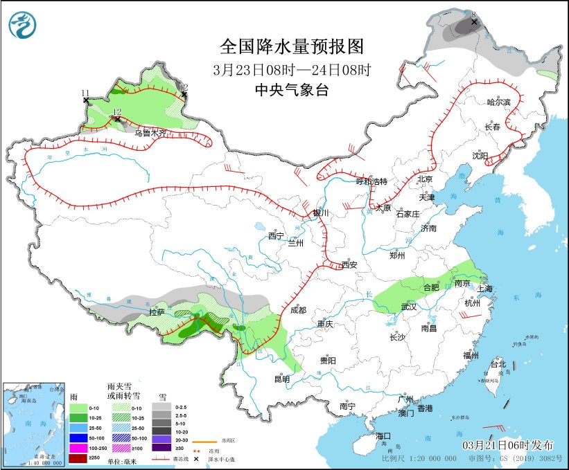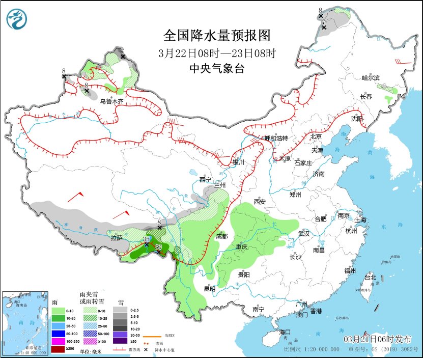 *3月22日08時至23日08時,*內蒙古東北部、黑龍江西北部、新疆北疆北部、西藏中南部、青海東南部、甘肅西南部、川西高原北部等地部分地區有小到中雪或雨夾雪,其中,內蒙古東北部、新疆北疆北部和沿天山地區、西藏東北部等地部分地區有大雪(5~8毫米)。西藏東南部、四川盆地大部、雲南中西部、貴州西部、重慶、陝西南部、湖北中西部、湖南北部等地部分地區有小到中雨,其中,西藏東南部局地有大雨(25~35毫米)。內蒙古中西部、黑龍江東部、西藏中北部等地部分地區有5~7級風,其中,西藏北部部分地區有7~8級風(見圖2)。