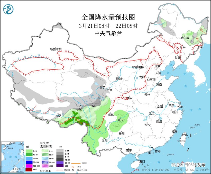 *3月21日08時至22日08時,*內蒙古東北部、黑龍江東部和西南部、新疆北部和西南部、西藏東部和北部、青海東部和南部、川西高原、甘肅西部等地部分地區有小雪或雨夾雪,其中,黑龍江東南部、西藏東北部、青海東南部、川西高原北部等地部分地區有中到大雪(5~7毫米)。西藏東南部、四川盆地西部、雲南中西部、貴州西北部、重慶西部等地部分地區有小到中雨。內蒙古中東部、黑龍江東部、西藏中北部等地部分地區有5~7級風(見圖1)。