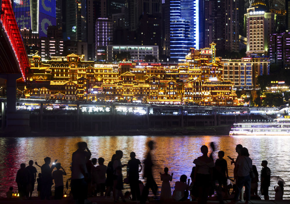 2024年8月23日,在重慶江北區嘉陵江畔,遊客在打卡重慶知名網紅景點——洪崖洞景區夜景。新華社記者 劉潺 攝