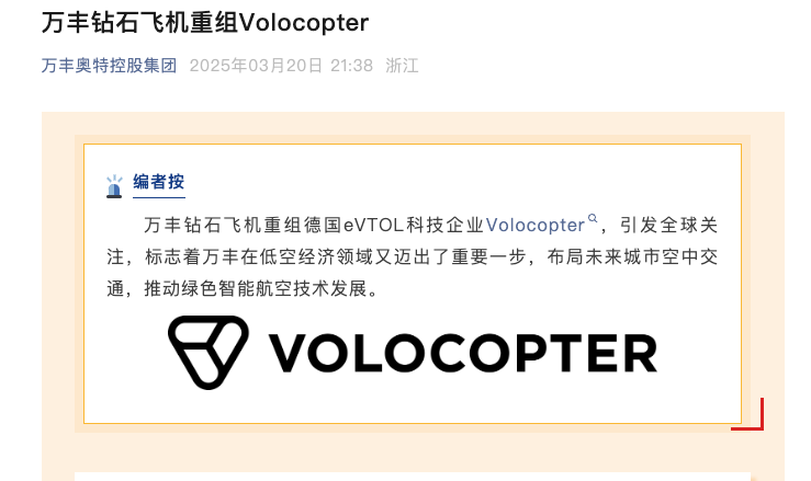 據悉,Diamond Aircraft系萬豐奧特控股集團有限公司旗下萬豐飛機事業部的子公司。公司重組Volocopter後,其飛機和業務組合將拓寬至電動城市空中交通出行領域。