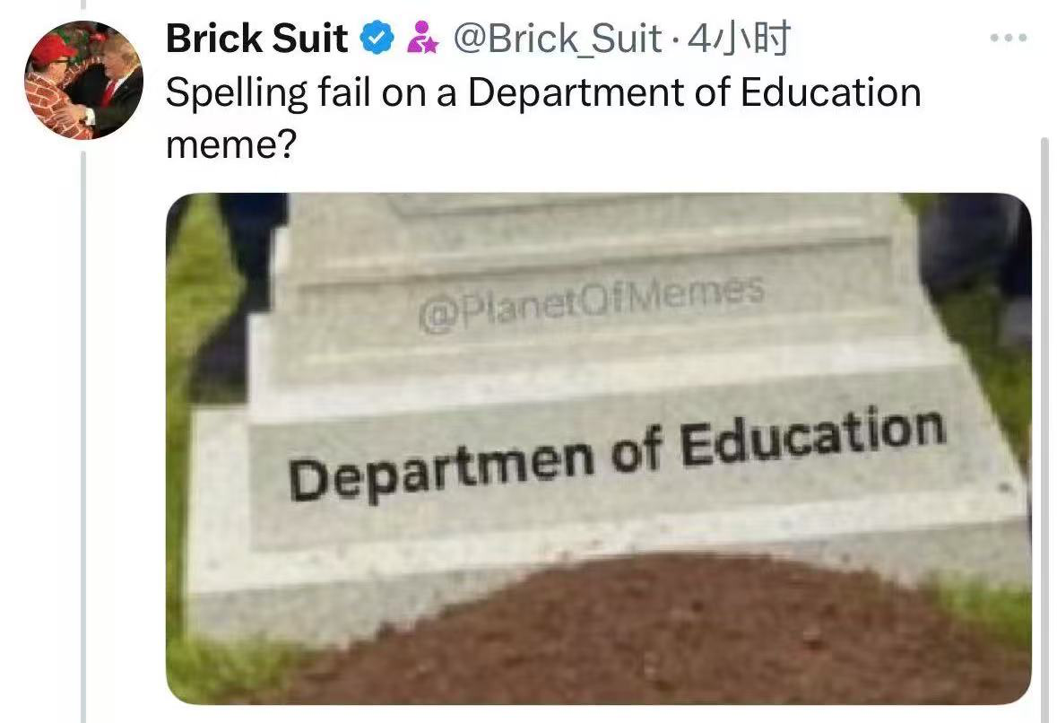 【環球網報道 見習記者 閆珮雲】美國總統特朗普當地時間20日在白宮簽署一項行政令,要求教育部長琳達·麥克馬洪採取一切必要措施推動教育部的關閉,將教育管理權歸還各州。美國《新聞週刊》報道稱,該國企業家埃隆·馬斯克當天在社交平台X上發文表示支持,並配上了一張經過PS處理的表情包,但其中出現的拼寫錯誤引發網友爭議。