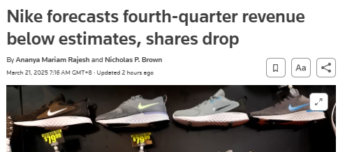 而耐克第三季度總同比收入下降9%,至112.7億美元;稀釋後每股收益同比下降30%,至54美分。這一結果超出了華爾街預期的收入下降11.5%至110.1億美元,以及每股收益下降62.2%。這主要得益於消費者對新款鞋如Pegasus Pro和Vomero 18的積極反應。