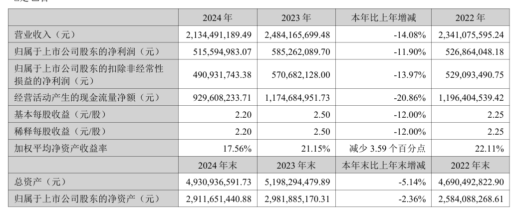 此外,該公司擬定2024年度利潤分配及資本公積金轉增股本預案為:以2024年12月31日的總股本234,331,485股為基數,向公司全體股東每10股派發現金紅利20元(含税),不以資本公積金轉增股本。
