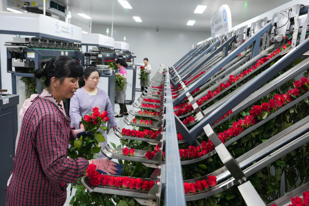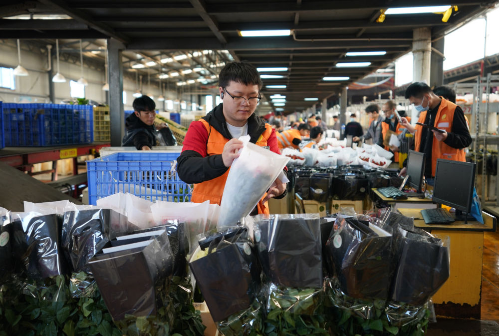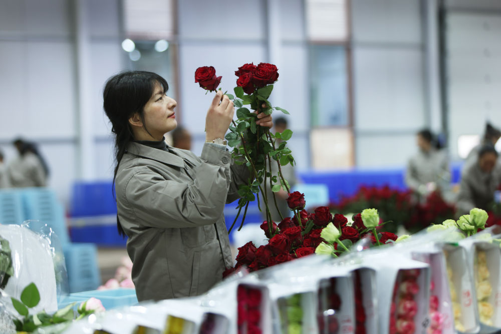 2022年11月11日,工作人員在昆明斗南花市給鮮花貼標籤。快遞物流時效不斷優化、冷鏈運輸技術持續提升,也為中國鮮花加速“出海”保駕護航。