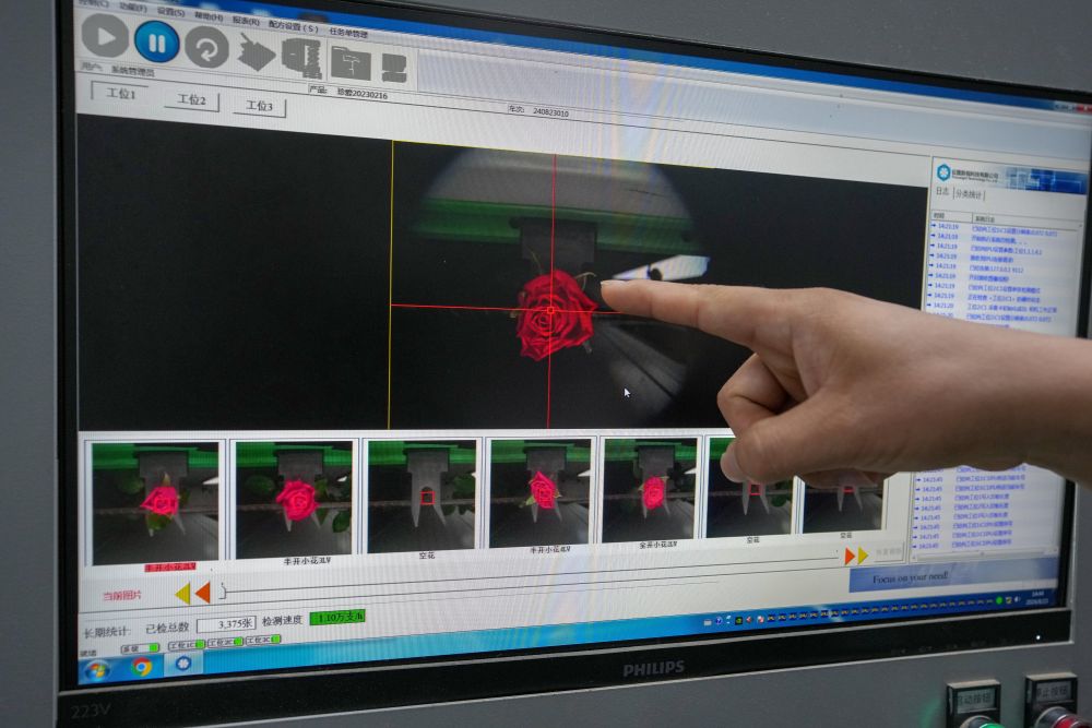 2024年8月23日,在雲南晉寧花卉產業現代化示範園採後處理中心,計算機在即時監測自動分揀流水線上的鮮切花。