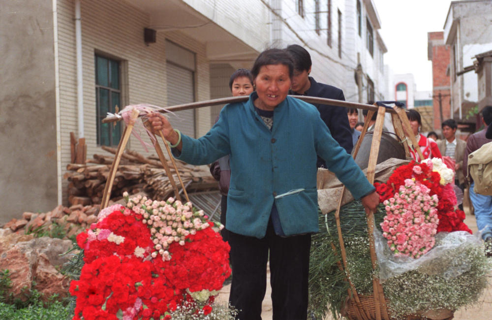 雲南省昆明市呈貢龍街鄉斗南村是中國有名的“花鄉”,全村幾乎家家種花。這是一位當地花農挑着一擔鮮花去花卉交易市場出售(1999年6月2日發)。