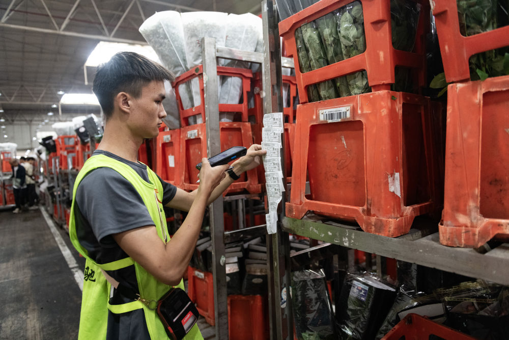 2023年7月13日,一名工作人員在昆明國際花卉拍賣交易中心內對台車上存放的鮮花掃碼。