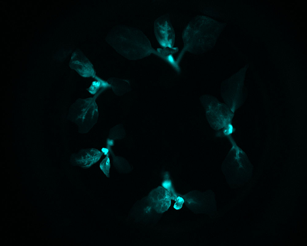 這是雲南某農業研發團隊利用基因技術成功培育出肉眼可見的“自發光植物”在黑暗條件下發光(2017年6月21日攝)。