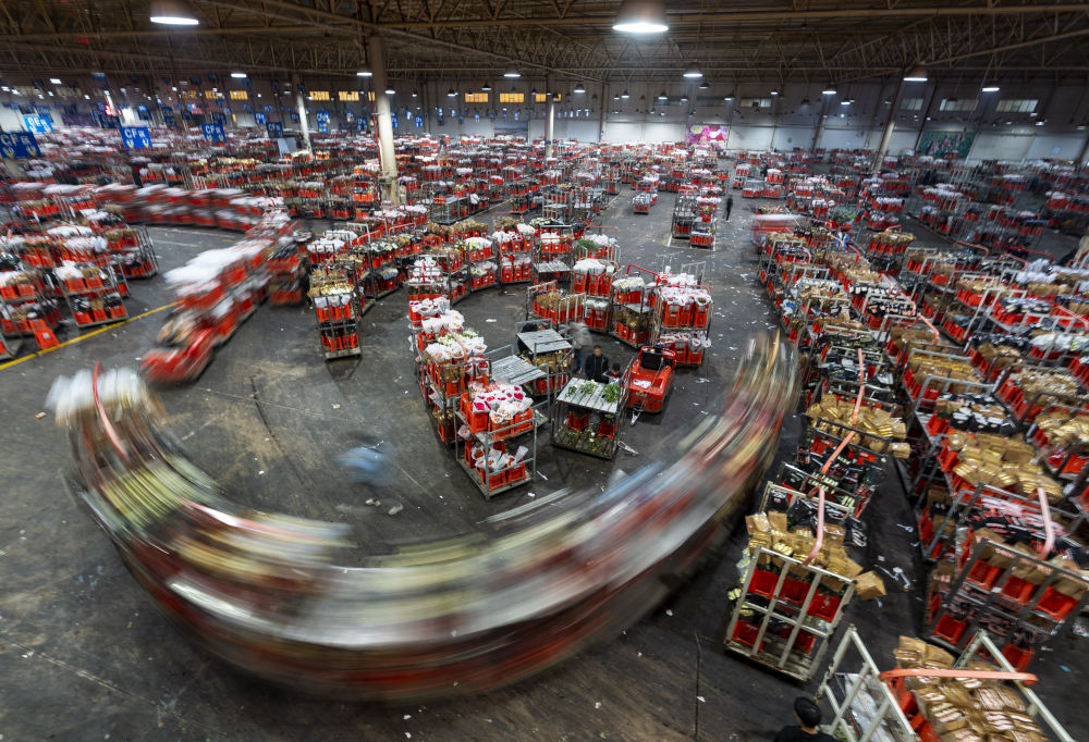2023年1月31日,台車在昆明國際花卉拍賣交易中心運輸鮮花。