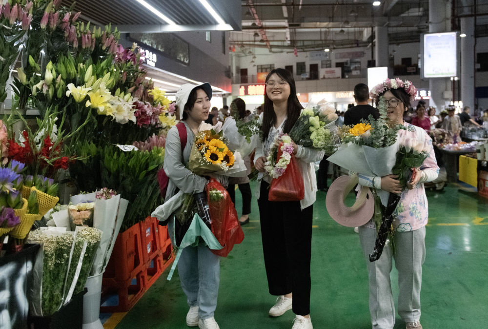 2023年7月13日,遊客在昆明斗南花卉市場內購買鮮花。