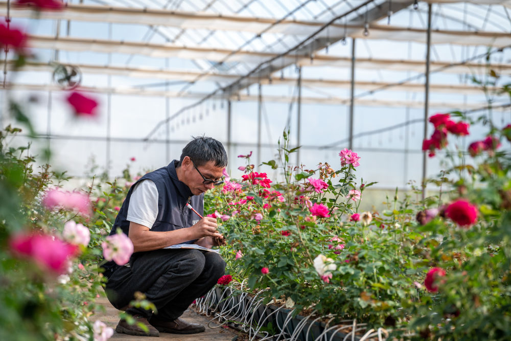 2023年10月20日,在雲南省安寧市現代農業園區玫瑰種植示範園,技術員田連通在記錄太空育種玫瑰花編號。