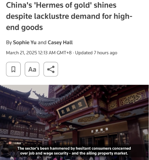 【環球網消費綜合報道】3月20日,路透社報道稱,國際品牌在中國市場消費疲軟的情況下,有“黃金中的愛馬仕”之稱的老鋪黃金卻逆勢而上,實現大幅增長。老鋪黃金作為中國本土崛起的奢侈品牌,正在俘獲大量曾經追逐蒂芙尼(Tiffany)和卡地亞(Cartier)等西方奢侈品牌的中國消費者。