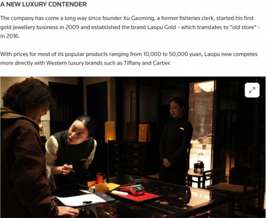 路透社認為,老鋪黃金的產品將中國傳統文化元素融入當代設計中,為消費者提供了精神上的力量。而其使用黃金製作高端商品的策略也得到了市場的認可,因為在中國消費者看來,相較於其他奢侈品珠寶,“黃金才是保值的最佳方式。“