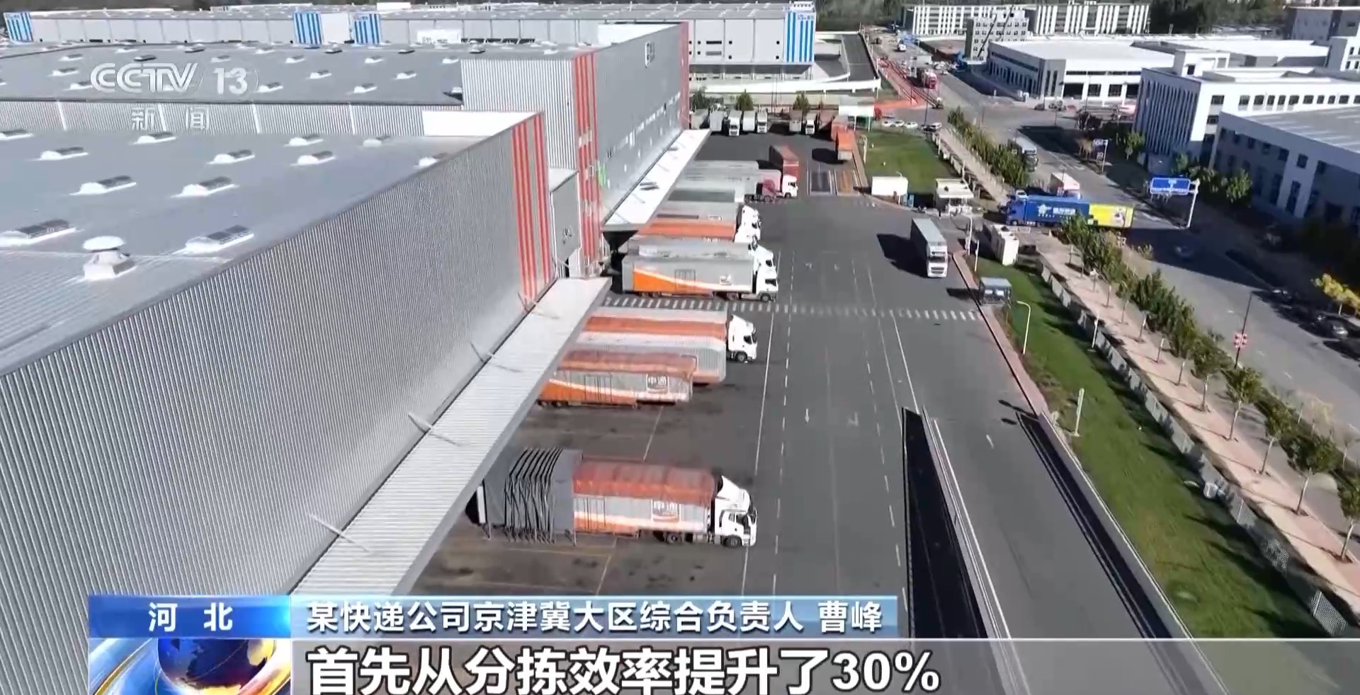 在廊坊固安的這家快遞公司華北轉運中心,近百個進出港卸貨口同時操作,全鏈路數智化設備同步運轉。大量快遞包裹在運輸帶上被快速掃描、分揀,整個過程都在智能管理系統的調配下完成,最快僅需10分鐘便可完成裝車。