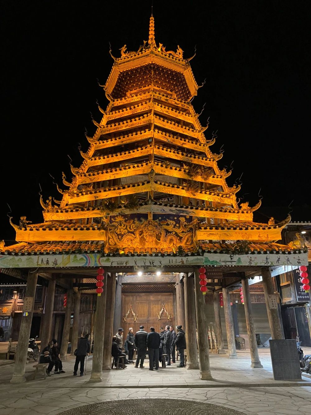 夜晚的肇興侗寨“信團鼓樓”。新華每日電訊記者駱飛攝
