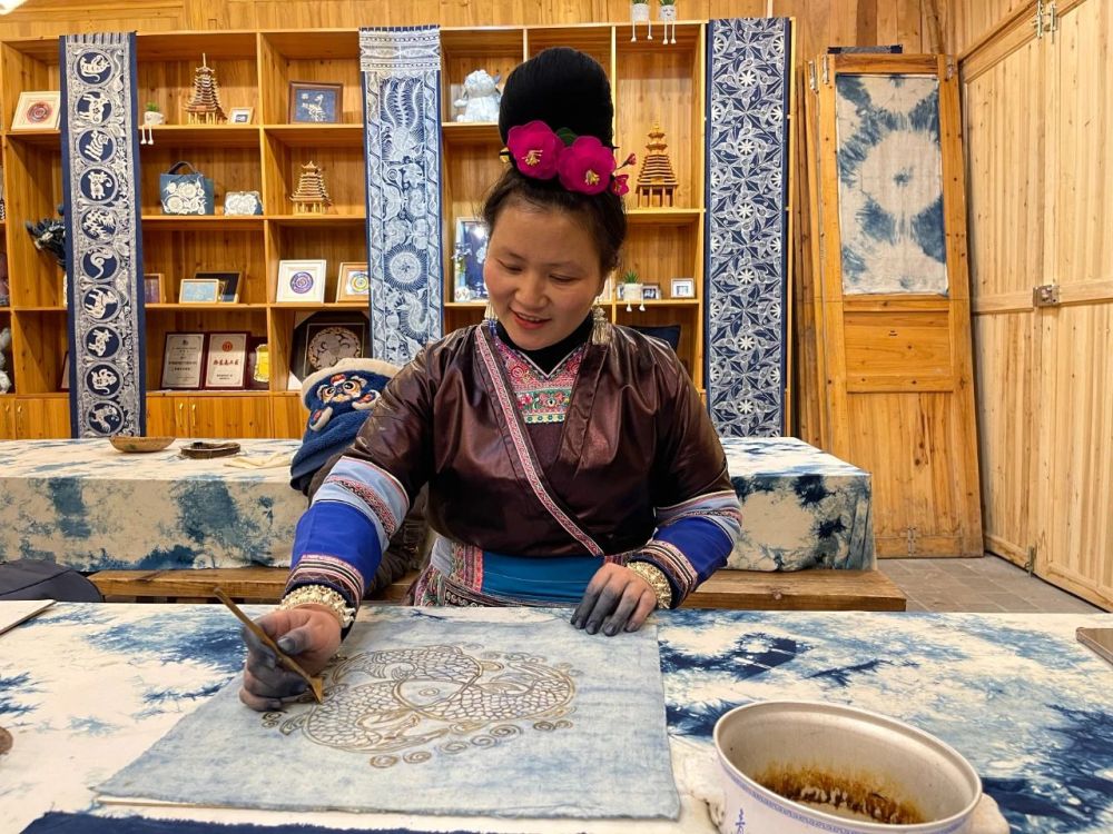 遇見肇興侗寨,人們必然會被當地刺繡、蠟染、侗族大歌等非遺技藝、民族文化所吸引。在侗鄉特色產業基地,黎平侗品源傳統工藝農民專業合作社負責人陸勇妹一直致力於傳承和推廣侗族刺繡、蠟染等非遺。