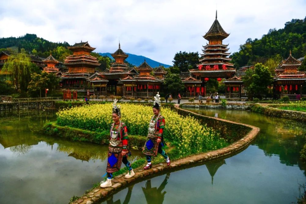 仲春時節,目光所及,一幅人和景美的春日山居圖正在這裏緩緩展開:放眼羣山,色彩斑斕,無邊的梯田宛如“腰帶”纏繞,金色的油菜花隨風搖曳,展現出“人勤春早”的侗鄉新面貌;古榕樹下、風雨橋上,侗族男女時常成羣結隊,彈琴唱歌,充滿青春活力;吊腳樓台,火塘旁邊,侗族婦女揹着娃、繡着花,一針一線既是傳承非遺的“指尖技藝”,也是增收致富的“指尖產業”。