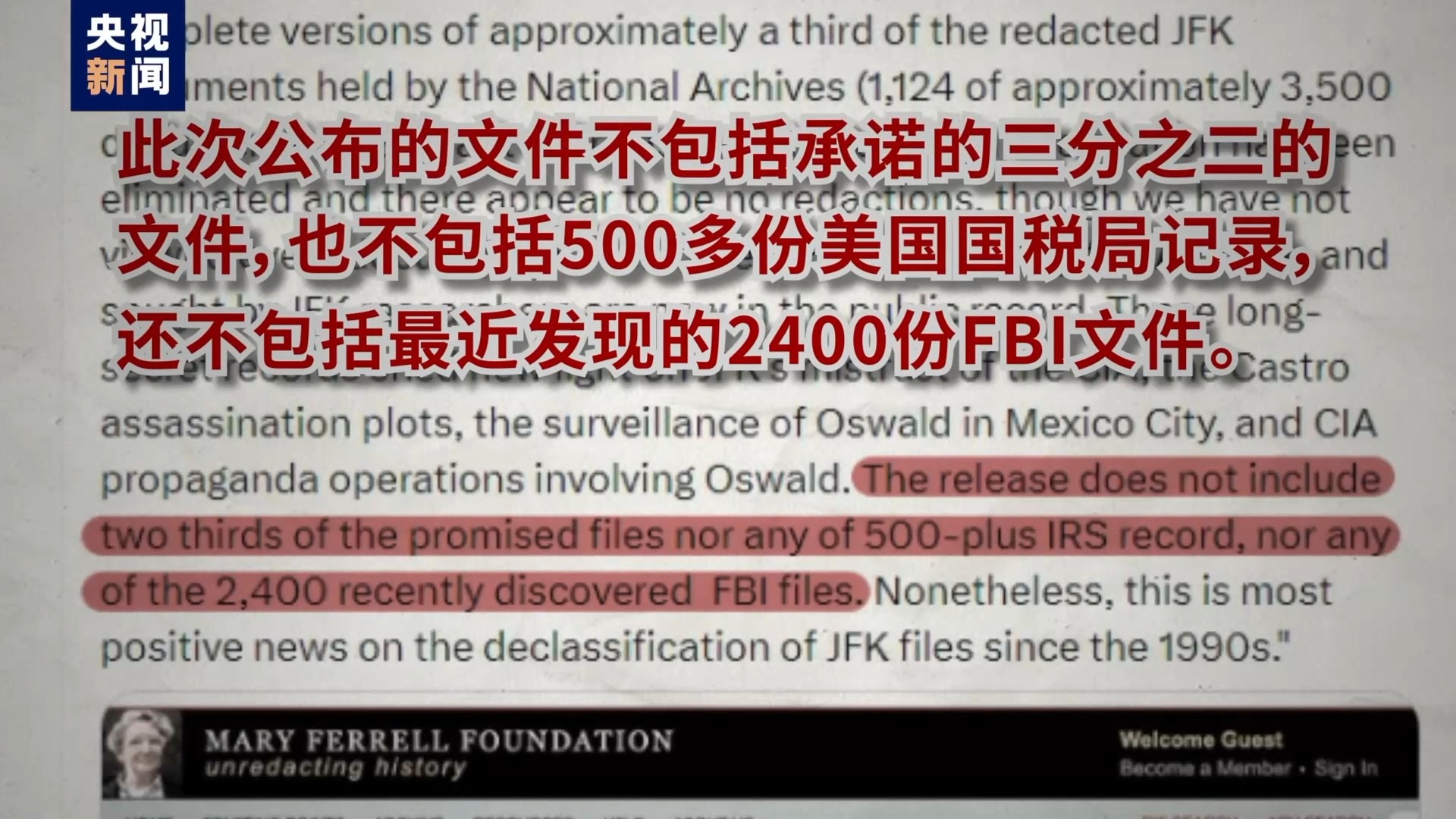 儘管特朗普強調公佈全部檔案不做任何塗改,但美國政府公佈的這所謂“最後的1%”,在數量和質量上,還是都打了折。該領域的“民間權威”,專注研究肯尼迪遇刺案和水門事件的瑪麗·費雷爾基金會的副總裁認為:“此次公佈的文件不包括承諾的三分之二的文件,也不包括500多份美國國税局記錄,還不包括最近發現的2400份FBI文件。”