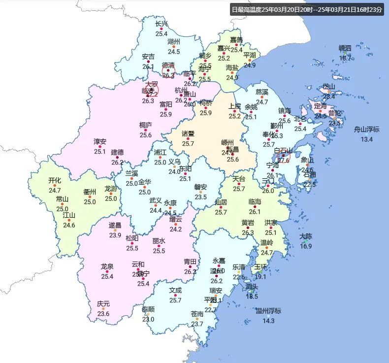 *今天白天最高温度:*浙南地區:25-27度;其它地區:27-29度。