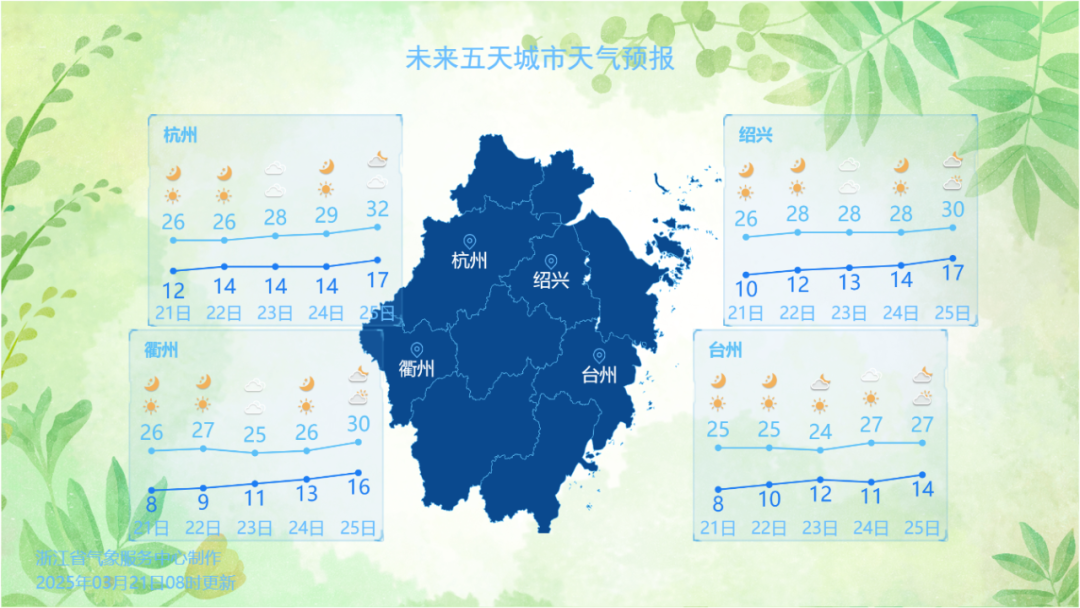 昨天我省大部最高氣温升至24-26℃。“全省最暖”被德清、臨安、黃岩同時拿下,最高都是26.3℃。