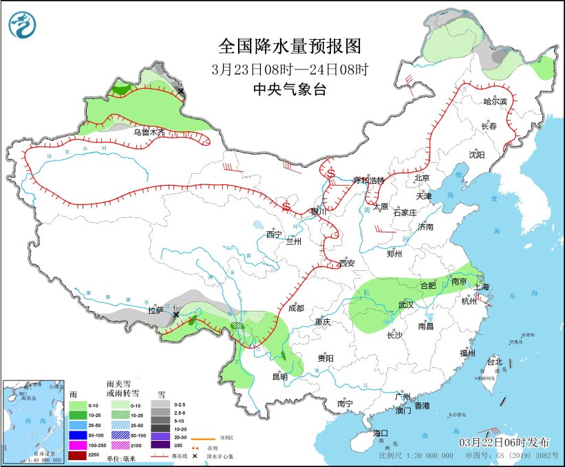 *3月22日08時至23日08時,*新疆北疆、內蒙古東北部、黑龍江北部、西藏東部和南部、青海東部、甘肅南部、川西高原北部等地部分地區有小到中雪或雨夾雪,局地有大雪(5~7毫米)。新疆北疆、西藏東南部、西南地區大部、江漢西部等地部分地區有小到中雨,局地有大雨(25~40毫米)。內蒙古中西部、遼東半島、西藏北部等地的部分地區有5~6級風,局地風力可達7級及以上(見圖1)。