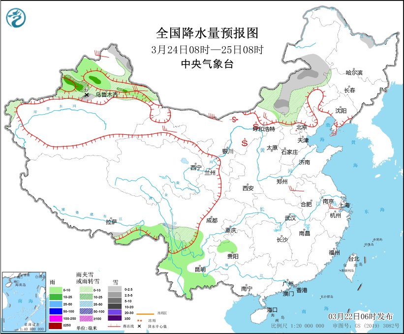 *3月24日08時至25日08時,*新疆北疆、內蒙古中東部、黑龍江西北部、河北北部、川西高原等地部分地區有小到中雪或雨夾雪,局地有大雪(5~6毫米)。新疆沿天山地區和伊犁河谷、西藏東南部、西南地區南部等地部分地區有小到中雨。新疆北疆北部和東部、甘肅河西、內蒙古西部、遼東半島等地部分地區有5~6級風,局地風力可達7級及以上(見圖3)。