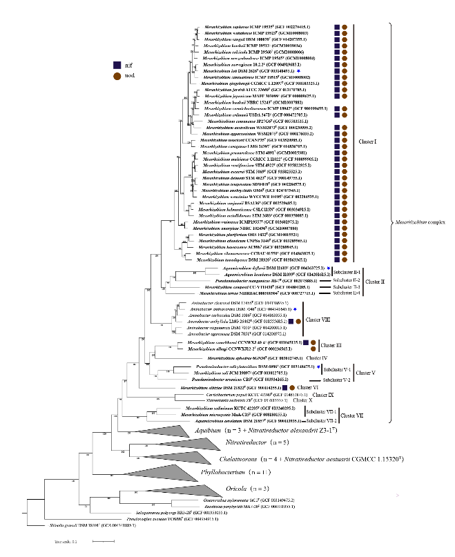 據瞭解,根瘤菌是農業微生物中的重要類羣,尤其在植物固氮過程中發揮着關鍵作用。然而,中慢生根瘤菌屬與近源的水生微生物、假氨基桿菌等屬的分類關係一直較為混亂,多個不同屬的物種在進化樹上混雜在一起。由於現有的微生物分類系統缺乏屬級分類的標準,這一問題嚴重阻礙了該類羣的系統學研究和實際應用。