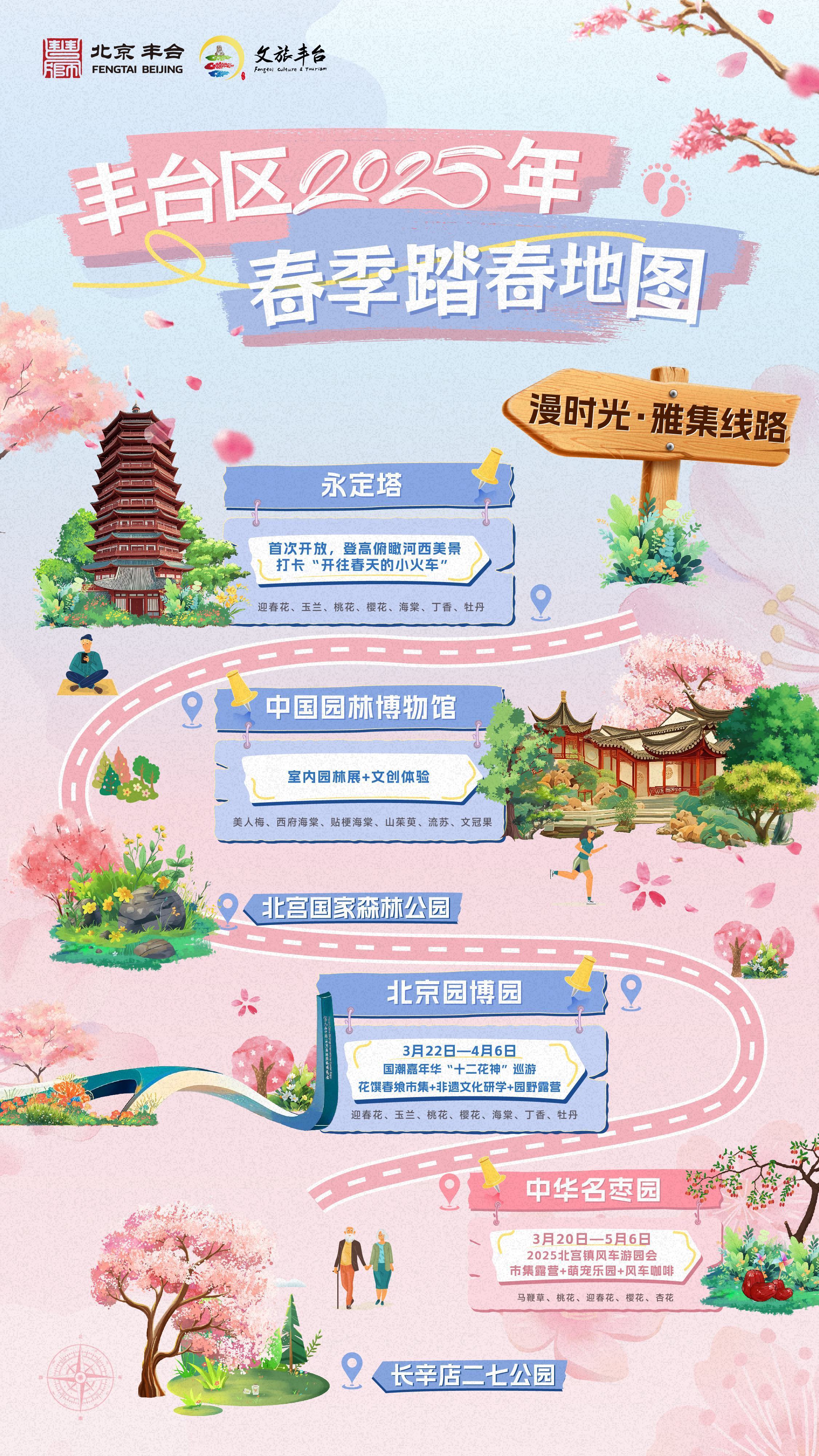 現場還進行了踏青賞花線路創新發布,從“生態秘境、文化博覽、親子研學、休閒度假”四個維度,重點推介了豐台區4條春季旅遊路線。其中,包含3條“一日主題漫遊路線”和1條“兩日休閒微度假路線”。