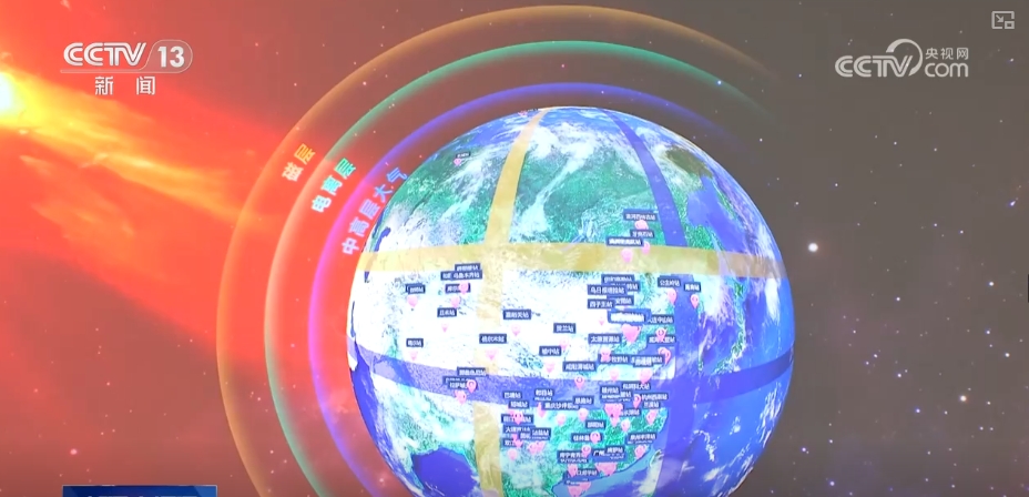 為了全方位監測太陽的一舉一動,中國科學院空間中心的科學家們是花了10多年的時間,在地球上是沿着東經120度、北緯30度、東經100度、北緯40度這樣兩縱兩橫很明顯的一個“井”字形,佈局了31個台站近300台設備,是首次實現了對日地空間環境全圈層多要素的這樣一個立體式綜合式探測。應該説,這是中國覆蓋面積最廣的一個國家重大科技基礎設施,也是中國地圖上守護地球最牛的一個“井”字。